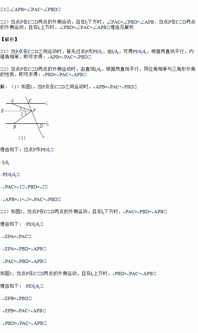 (1)如果P点在C、D之间运动时,如图(1)问∠PAC,∠APB,∠PBD之间有何关系,并说明理由.