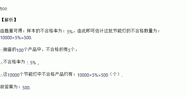 某生产商生产了一批节能灯,共计10000个,为了测试节能灯的使用寿命(使用寿命大于等于6000小时为合格产品),从中随机挑选了100个产品进行测试,有5个不合格产品,预计这批节能灯有_________个不合格产品.