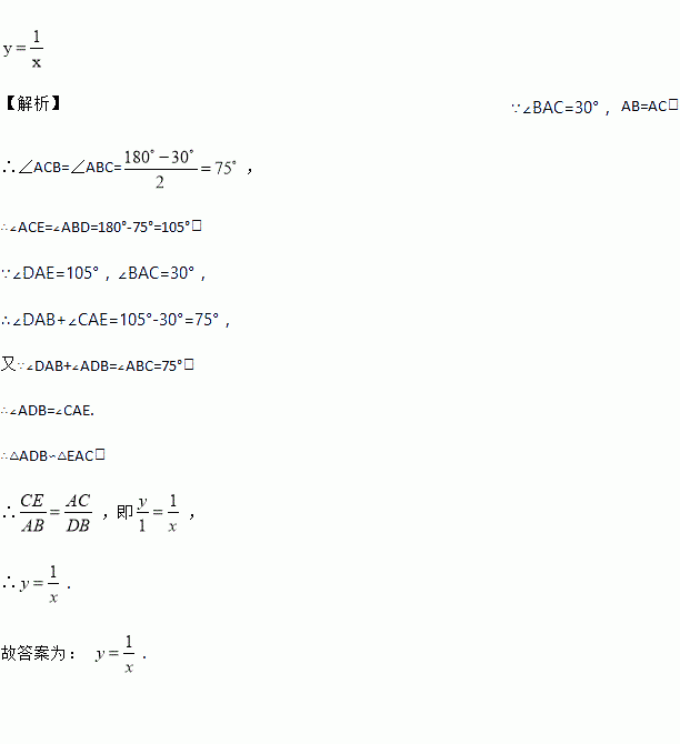 如图,在△ABC中,AB=AC=1,点D、E在直线BC上运动,设BD=x,CE=y.如果∠BAC=30°,∠DAE=105°,则y与x之间的函数关系式为________________.