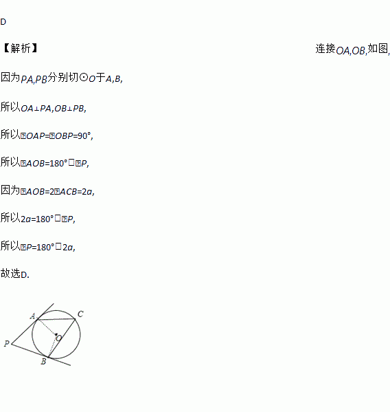 圆外一点P,PA、PB分别切⊙O于A、B,C为优弧AB上一点,若∠ACB=a,则∠APB=( )