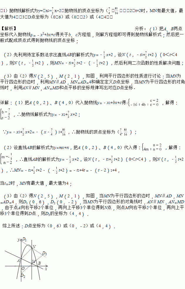 (3)在(1)的情况下,以A、M、N、D为顶点作平行四边形,请直接写出第四个顶点D的所有坐标(直接写出结果,不必写解答过程)