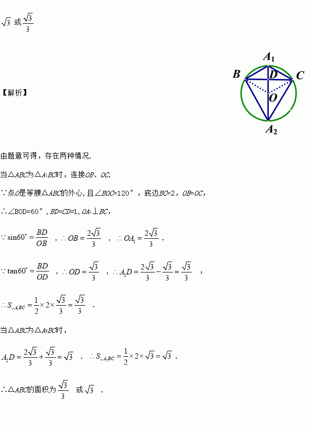 若点O是等腰△ABC的外心,且∠BOC=120°,底边BC=2,则△ABC的面积是_____.