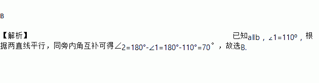 如图,直线l与直线a,b相交,且a∥b,∠1=110º,则∠2的度数是 ( )