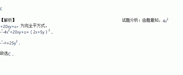小兵计算一个二项式的平方时,得到正确结果4x2+20xy+(),但最后一项不慎被污染了,这一项应是( )