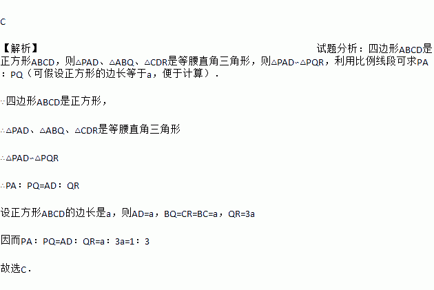 如图,正方形ABCD的边BC在等腰直角三角形PQR的底边QR上,其余两个顶点A、D分别在PQ、PR上,则PA∶AQ=( ).