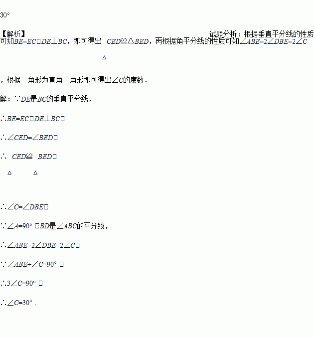 如图,在△ABC中,∠A=90,BD是∠ABC的平分线,DE是BC的垂直平分线,求∠C的度数.