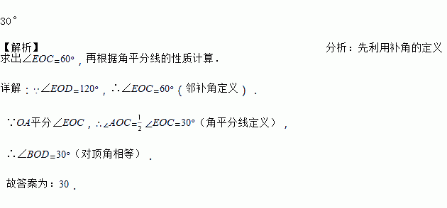 如图,直线AB,CD相交于点O,OA平分∠EOC,∠EOD=120°,则∠BOD=________ °