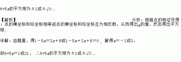 若点P(1-5a,2a+8)到两坐标轴的距离相等,求6+5a的平方根.