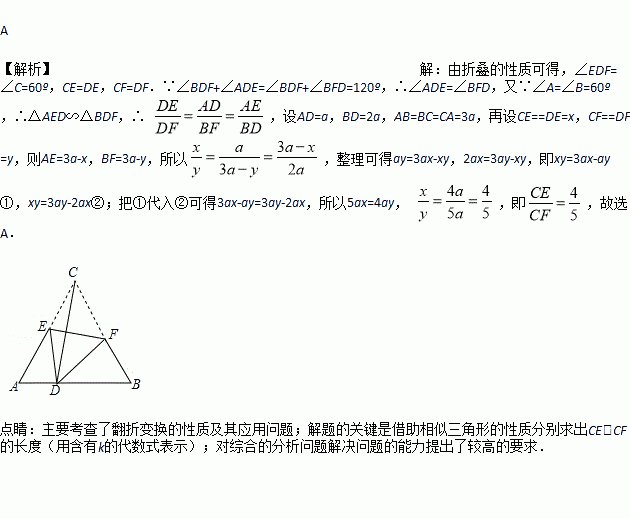 如图,D是等边△ABC边AB上的一点,且AD:DB=1:2,现将△ABC折叠,使点C与D重合,折痕为EF,点E、F分别在AC和BC上,则CE:CF的值为( )