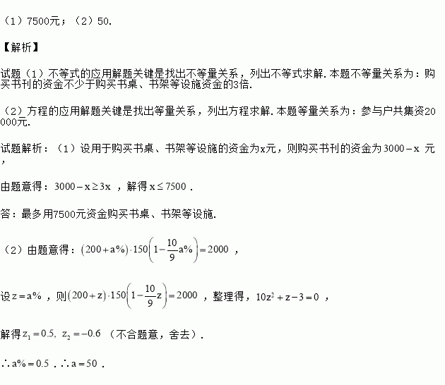 (1)筹委会计划,购买书刊的资金不少于购买书桌、书架等设施资金的3倍,问最多用多少资金购买书桌、书架等设施?
