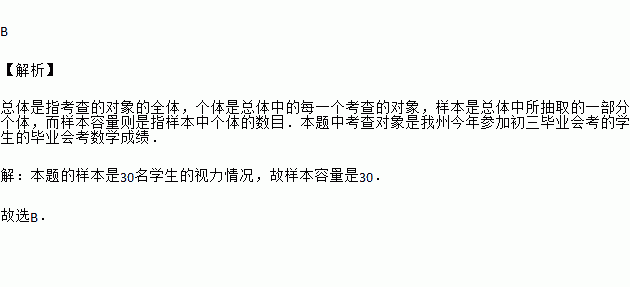为了了解某中学初三800名学生的视力情况,从中随机抽取了30名学生进行调查,在此次调查中,样本容量为( )