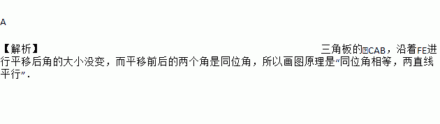 A 【解析】三角板的∠CAB,沿着FE进行平移后角的大小没变,而平移前后的两个角是同位角,所以画图原理是“同位角相等,两直线平行”.