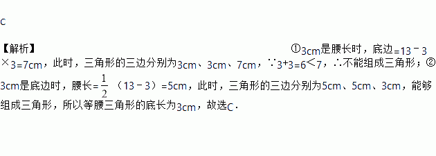 等腰三角形的周长为13cm,其中一边长为3cm.则该等腰三角形的底长为( )
