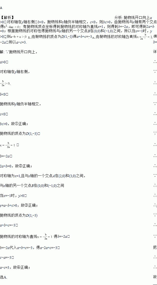 如图,抛物线y=ax2+bx+c的顶点为B(1,﹣3),与x轴的一个交点A在(2,0)和(3,0)之间,下列结论中:①bc>0;②2a+b=0;③a﹣b+c>0;④a﹣c=3,正确的有( )个