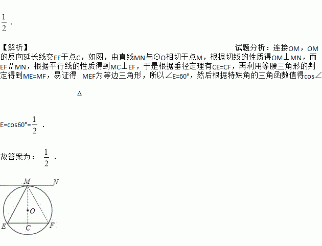 如图,直线MN与⊙O相切于点M,ME=EF且EF∥MN,则cos∠E= .
