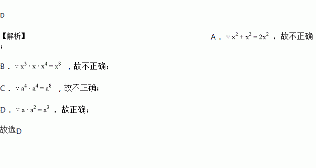 A. x2+x2=x4 B. x3•x•x4=x7 C. a4•a4=a16 D. a•a2=a3