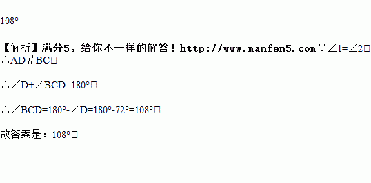 如图所示,四边形ABCD中,∠1=∠2,∠D=72°,则∠BCD=_______.