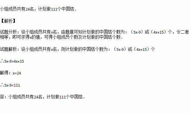 列方程解应用题:某小组计划做一批“中国结”,如果每人做5个,那么比计划多了9个;如果每人做4个,那么比计划少了15个.小组成员共有多少名?他们计划做多少个“中国结”?