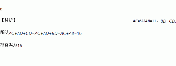 B 【解析】AC=5,AB=11,BD=CD, 所以AC+AD+CD=AC+AD+BD=AC+AB=16. 故答案为16.