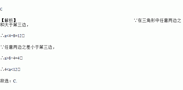 已知三角形的三边分别为4、a、8,那么a的取值范围是 ( )