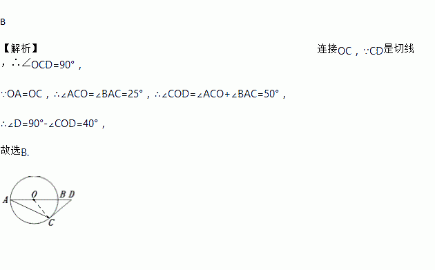 如图,AB为⊙O的直径,点C为⊙O上的一点,过点C作⊙O的切线,交直径AB的延长线于点D,若∠A=25°,则∠D的度数是( )