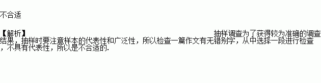 小芳为了帮助同学检查一篇作文有无错别字,从中选择一段进行检查,这种抽样调查的方法是________的(填“合适”或“不合适”).