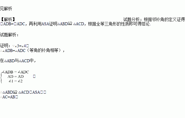 已知:如图 , ∠1=∠2 , ∠3=∠4求证:AC=AB.