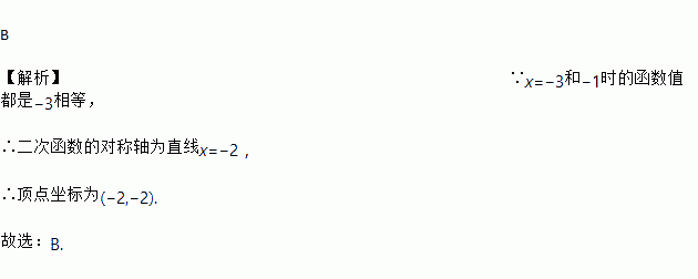 B 【解析】∵x=?3和?1时的函数值都是?3相等, ∴二次函数的对称轴为直线x=?2, ∴顶点坐标为(?2,?2). 故选:B.