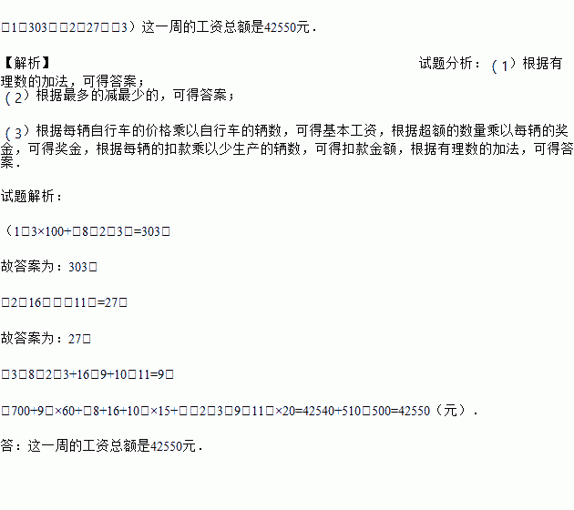(3)若该厂实行按生产的自行车数量的多少计工资,即计件工资制.如果每生产一辆自行车就可以得人民币60元,超额完成任务,每超一辆可多得15元;若不足计划数的,每少生产一辆扣20元,那么该厂工人这一周的工资总额是多少?