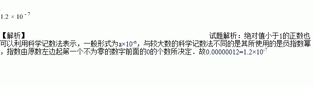 某种感冒病毒的直径是0.00000012米,将0.00000012用科学记数法可表示为_______.