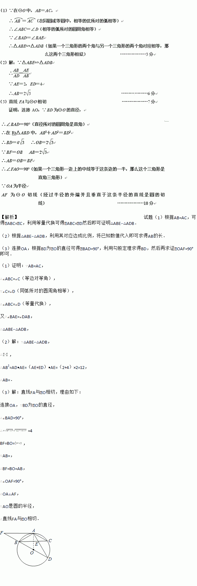 如图,BD为⊙O的直径,AB=AC,AD交BC于点E,AE=2,ED=4,