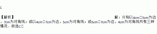 以长为5cm, 4cm, 7cm的三条线段中的的两条为边,另一条为对角线画平行四边形,可以画出形状不同的平行四边形的个数是 ( )