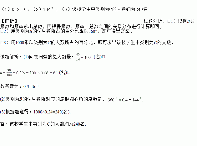 (2)根据表中数据,求扇形统计图中类别为B的学生数所对应的扇形圆心角的度数;