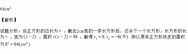 64cm2 【解析】 试题分析:设正方形的边长为,截去2cm宽的一条长方形后,还余下一个长方形,长方形的长为,宽为,面积,解得所以原来正方形铁皮的面积为