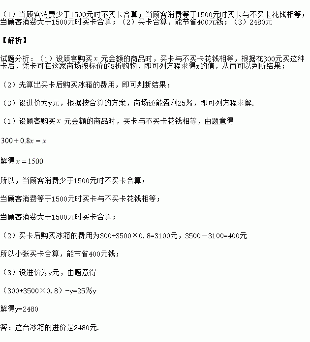 (1)当顾客消费少于1500元时不买卡合算;当顾客消费等于1500元时买卡与不买卡花钱相等; 当顾客消费大于1500元时买卡合算;(2)买卡合算,能节省400元钱;(3)2480元 【解析】 试题分析:(1)设顾客购买元金额的商品时,买卡与不买卡花钱相等,根据花300元买这种卡后,凭卡可在这家商场按标价的8折购物,即可列方程求得x的值,从而可以判断结果; (2)先算出买卡后购买冰...