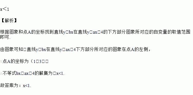 如图,函数y=bx和y=ax+4的图象相交于点A(1,3),则不等式bx<ax+4的解集为________.