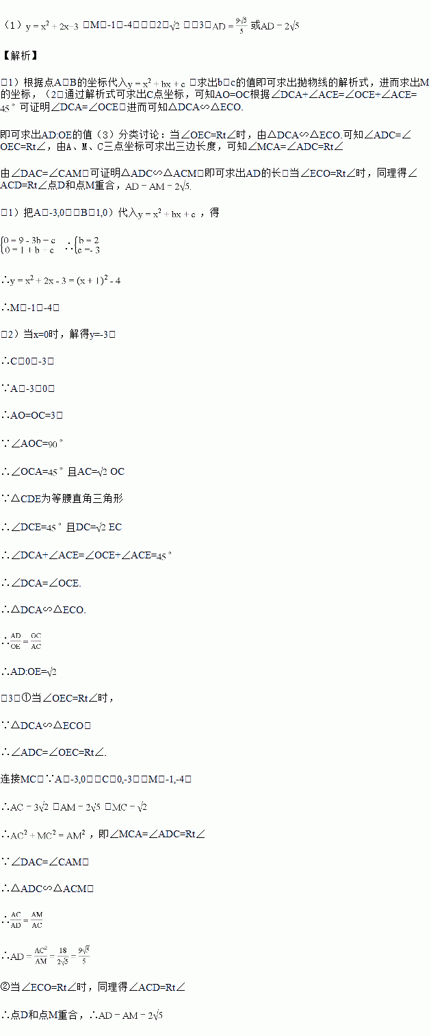 与x轴的焦点为A(-3,0),B(1,0),与y轴交于点C,连结AM,AC,点D为线段AM上一动点(不与A重合),以CD为斜边在CD上侧作等腰Rt△DEC,连结AE,OE.