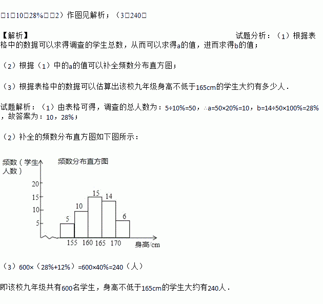 (3)该校九年级共有600名学生,估计身高不低于165cm的学生大约有多少人?