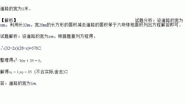 要在长32m,宽20m的长方形绿地上修建宽度相同的道路,六块绿地面积共570m2,问道路宽应为多宽?