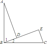 分析:首先根据垂直定义可得∠E=∠ADB=90°,再根据三角形内角和定义可得∠A+∠1=90°,又有∠1+∠2=90°,再根据同角的余角相等可得∠A=∠2.,再加上条件∠E=∠ADB=90°,AB=BC,可利用AAS定理证明△ABD≌△BCE,进而得到AD=BE.