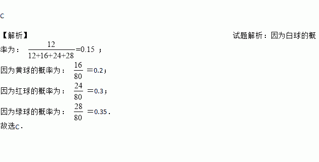 C 【解析】试题解析:因为白球的概率为: ; 因为黄球的概率为: =0.2; 因为红球的概率为: =0.3; 因为绿球的概率为: =0.35. 故选C.