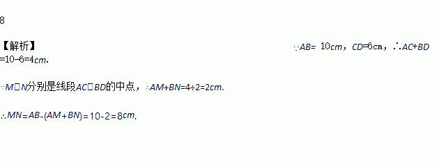 如图,已知C,D两点在线段AB上,AB= 10cm,CD=6cm,M,N分别是线段AC,BD的中点,则MN =__________cm.
