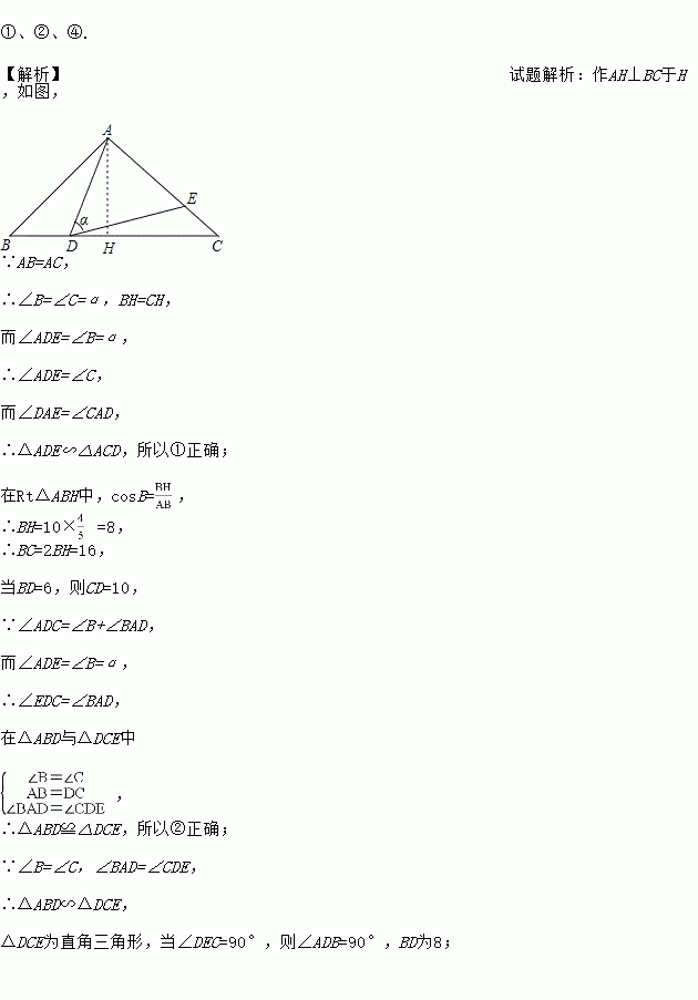 如图,在△ABC中,AB=AC=10,点D是边BC上一动点(不与B,C重合),∠ADE=∠B=α,DE交AC于点E,且cosα=