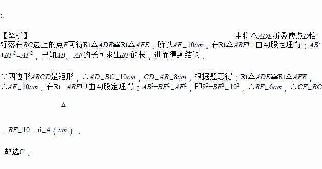 如图,已知长方形ABCD中AB = 8cm,BC = 10cm,在边CD上取一点E,将△ADE折叠,使点D恰好落在BC边上的点F,则CF的长为( )