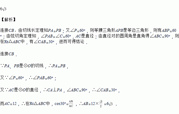 如图,PA、PB是⊙O的两条切线,切点分别为A、B,若直径AC=12cm,∠P=60°.求弦AB的长.