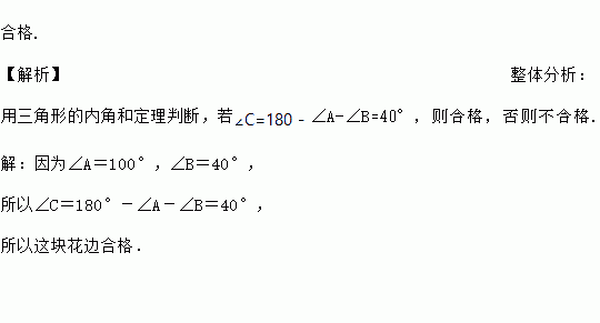 如图,是一块三角形花边,要求接合处(图中的∠ C )两边所成的角是40°,由于无法量取,所以量得∠ A =100°,∠ B =40°,那么这块花边是否合格?
