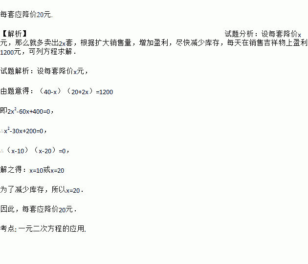 每套应降价20元. 【解析】试题分析:设每套降价x元,那么就多卖出2x套,根据扩大销售量,增加盈利,尽快减少库存,每天在销售吉祥物上盈利1200元,可列方程求解. 试题解析:设每套降价x元, 由题意得:(40-x)(20+2x)=1200 即2x2-60x+400=0, ∴x2-30x+200=0, ∴(x-10)(x-20)=0, 解之得:x=10或x=...