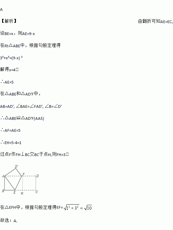 如图,将矩形ABCD沿EF折叠,点C落在A处,点D落在D′处.若AB=3,BC=9,则折痕EF的长为( )