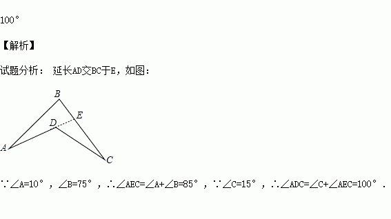 有个零件如图所示,现已知∠A=10°,∠B=75°,∠C=15°,则∠ADC= .