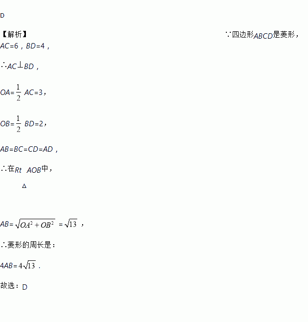 如图,菱形ABCD的两条对角线相交于点O,若AC=6,BD=4,则菱形ABCD的周长是 ( )